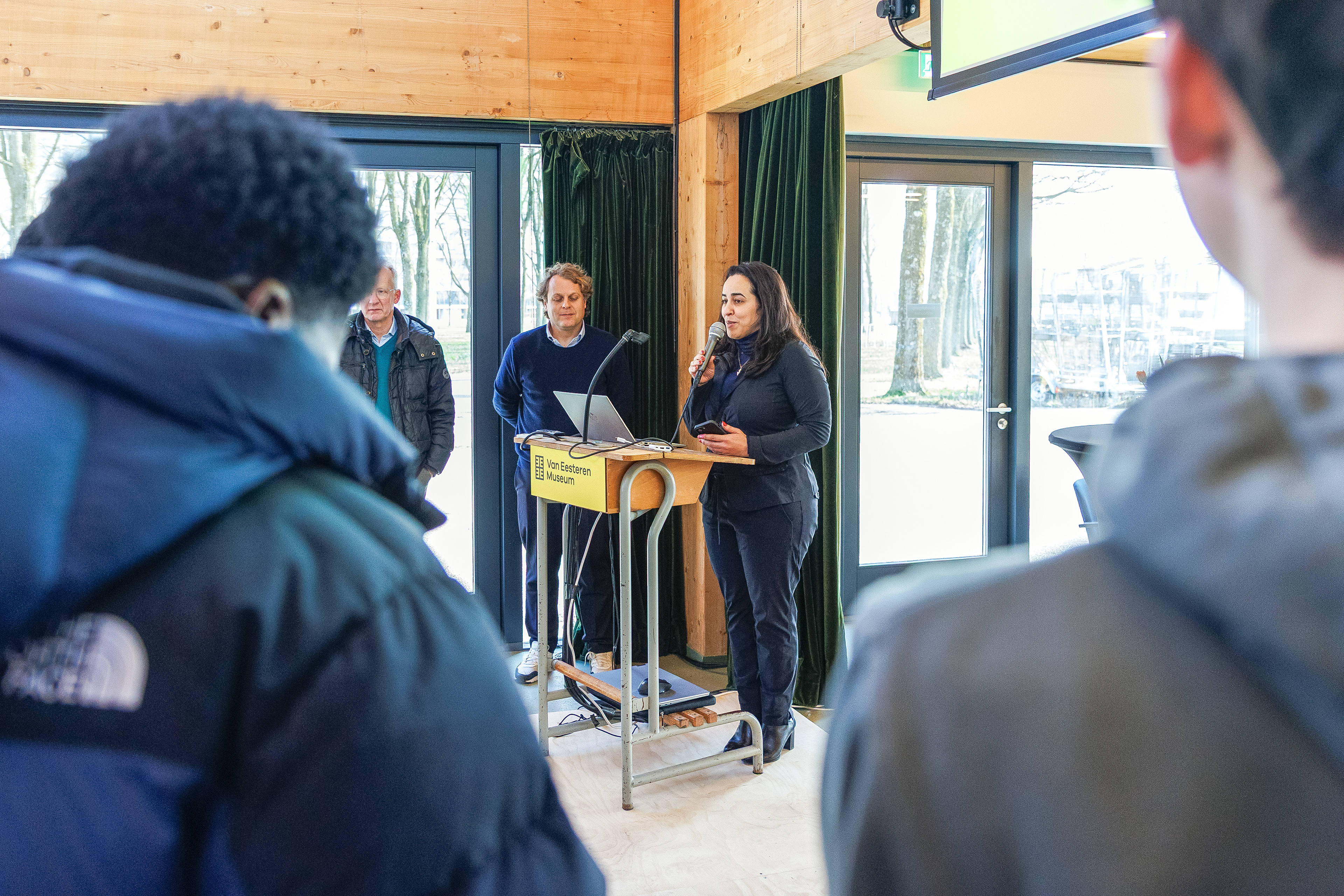 In the pop-up exhibition "De Nieuwe Meervaart: A New Theater for Nieuw-West", young people from Amsterdam and the surrounding area present their vision for De Nieuwe Meervaart. For this educational project by the Van Eesteren Museum, carried out in close collaboration with Theater De Meervaart, more than 250 students from six high schools developed designs for a future theater building in which they see themselves reflected. The visual design depicts a curtain in an abstract and playful manner, highlighting the themes of theater and the staged presentation of the submissions.